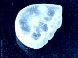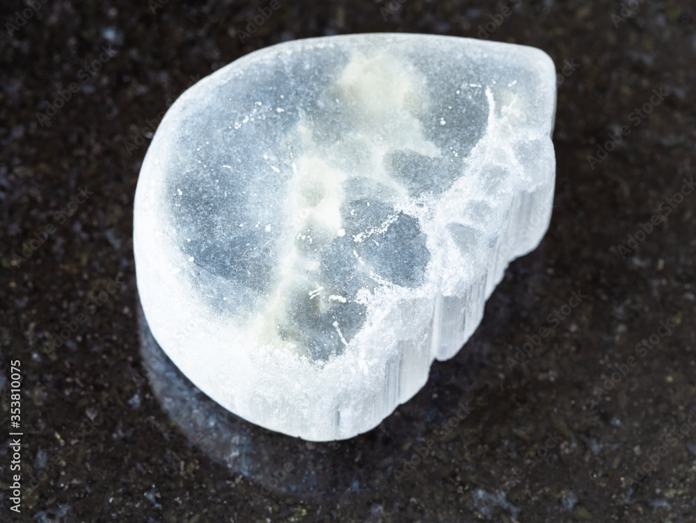 closeup of sample of natural mineral from geological collection - tumbled Ulexite (TV rock) stone on black granite background from California, USA