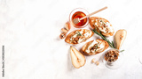 Toast with cheese, pear, honey and nuts. Delicious breakfast or snack with brie camembert cheese on a light background, top view