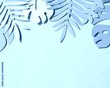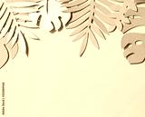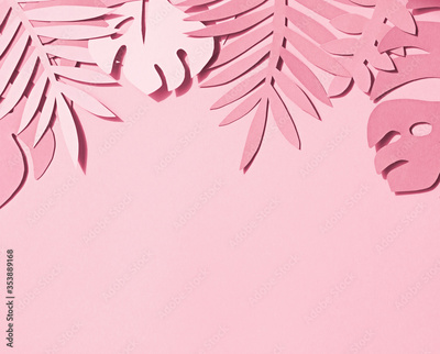 Toned photo of hand cut paper tropical plants leaves on the pink background. Summer concept Top view