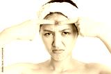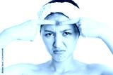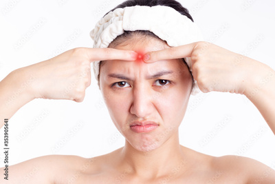 Large acne, pimple or blemishes on beauty girl face. Beautiful young asia woman popping inflammation acne or pustules pimple. Acne occur from hormonal change. Young lady squeezing pimple, removing it