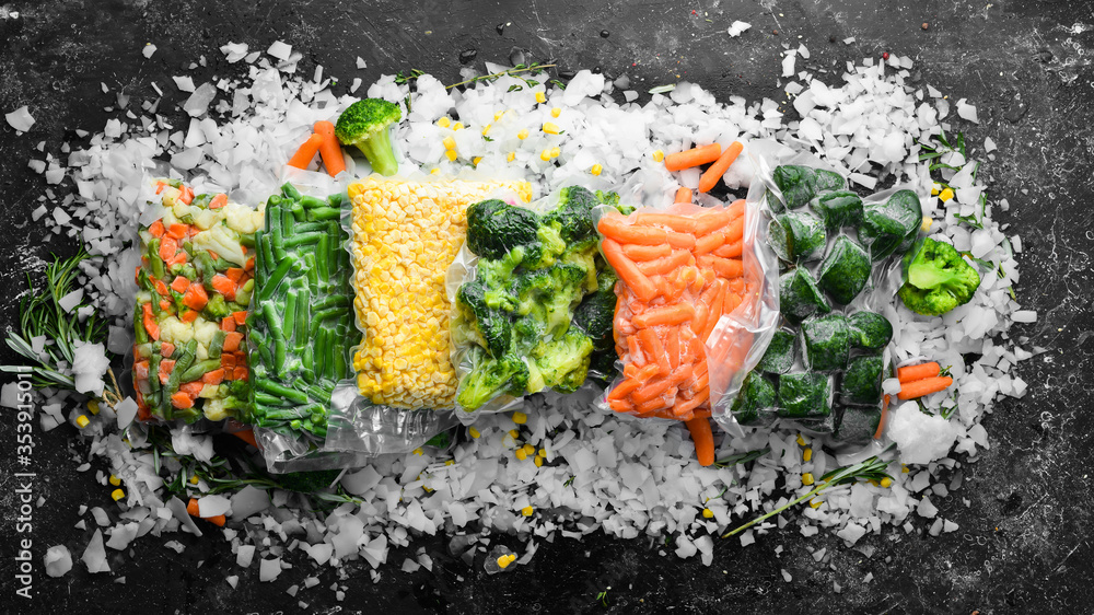 Assortment of frozen vegetables on ice. Stocks of food. Top view. Free space for your text.