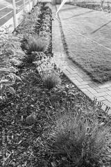 Garden with fresh new lawn, bark mulch area to reduce weed growth and your plants