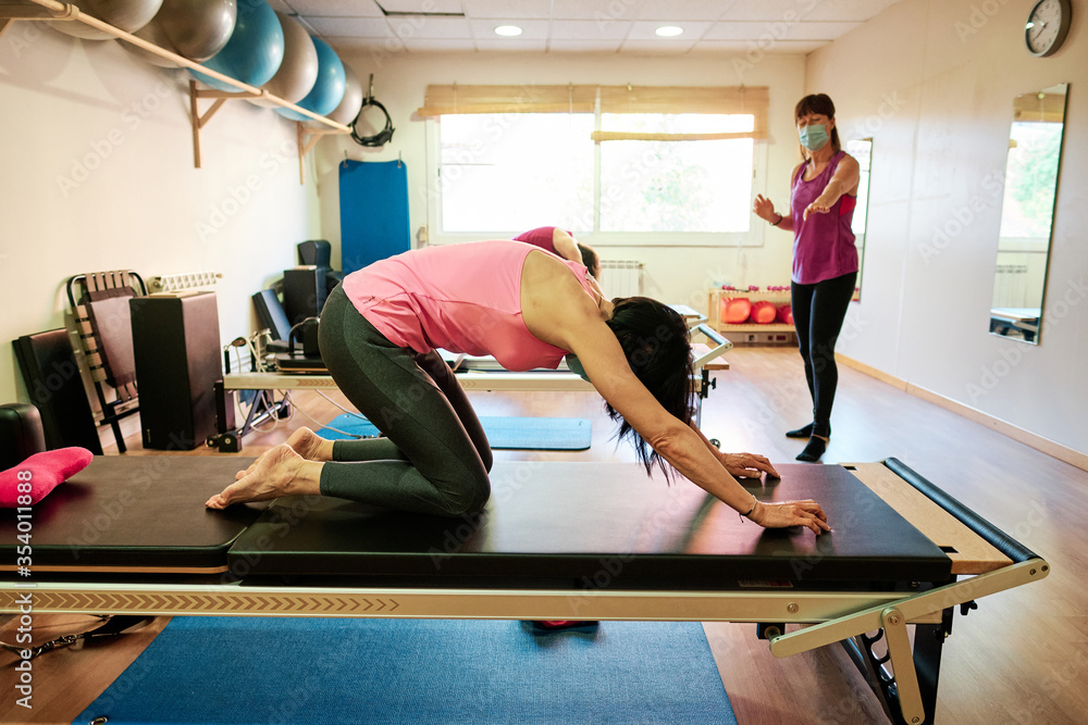 group of mature women doing excercise, Pilates and Yoga with social distancing and face mask