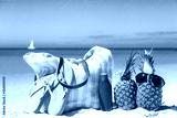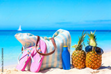Beach accessories on sand for summer vacation concept. Bag, flip flops, tropical pineapples cocktails pina colada and sunscreen lotion bottle on caribbean beach. Saona island, Dominican Republic.