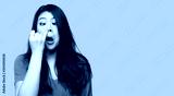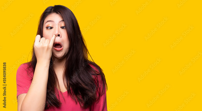 Girl stuffed nose and pick nose by using finger because she can not breath. She get flu and cold. Asian woman running nose and she try to stopping snot running out from her nose. It look disgusting