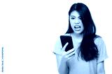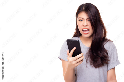 Angry girl shouting to smart phone, enraged of bad service, burning of rage. Frustrated woman having problem with not working mobile phone. Annoyed female yelling when get spam of text message or mail