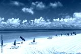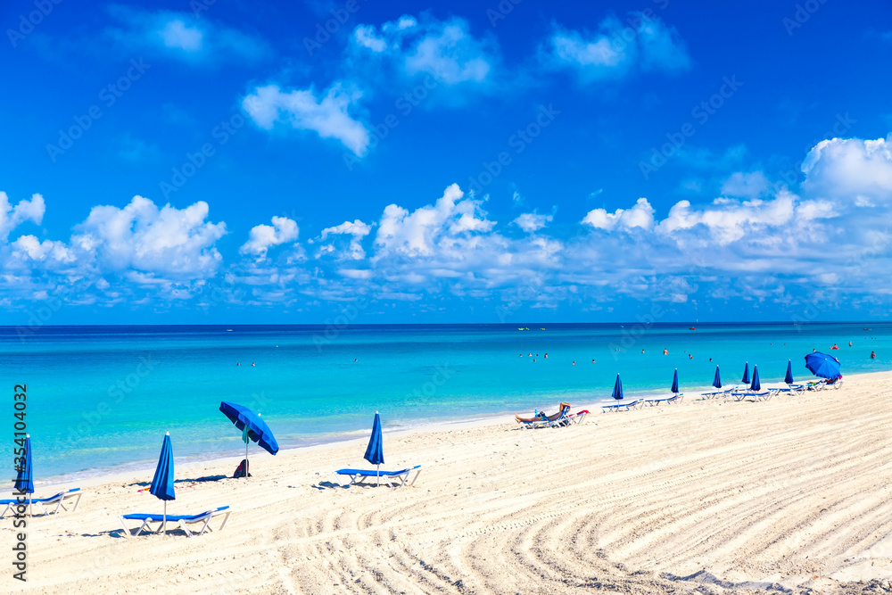 Sun loungers under umbrellas on the sandy beach by the sea and sky. Vacation background. Idyllic beach landscape in Varadero, Cuba