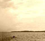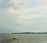 Fishing boat on brown colored lagoon with a beautiful sky in Thailand