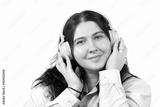 Happy smiling brunette woman with headphones listening to music isolated on white background. Litening to music concept.