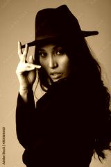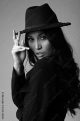 Elegant and chic asian model in black coat and hat. Studio shoot.