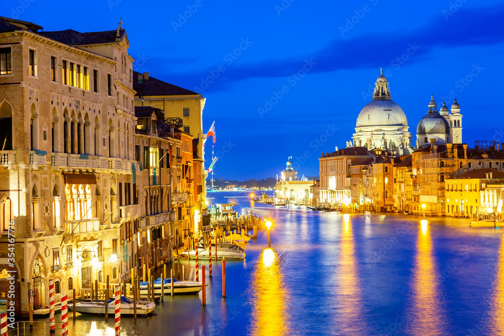 Basilica Santa Maria della Salute, Punta della Dogona and Grand Canal at blue hour sunset in Venice, Italy with reflections.