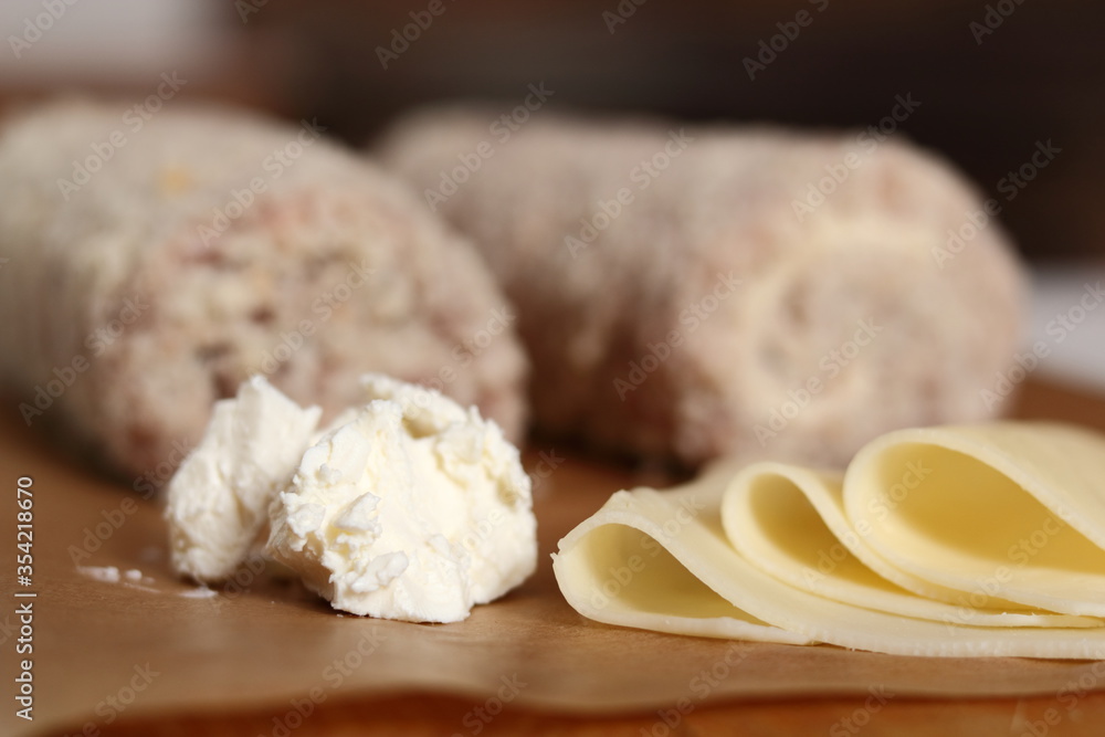 Uncooked meat roulade. Rolled meat with a filling of cheese and ham.
