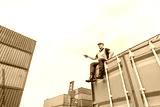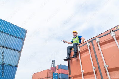 Foreman wearing safety suit and hardhat holding radio sitting on containers in shipping yard for logistics and import export company.