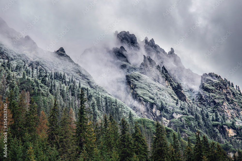 Foggy mountains in the spring. Tatra Mountains with green forest and the fog. Spiritual and mysterious photography. Beautifull landscape in Poland.