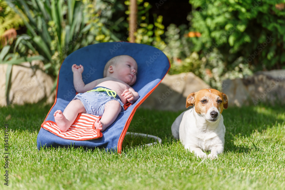 Baby boy lies on a deck-chair with dog on green lawn. Relax and vacation concept
