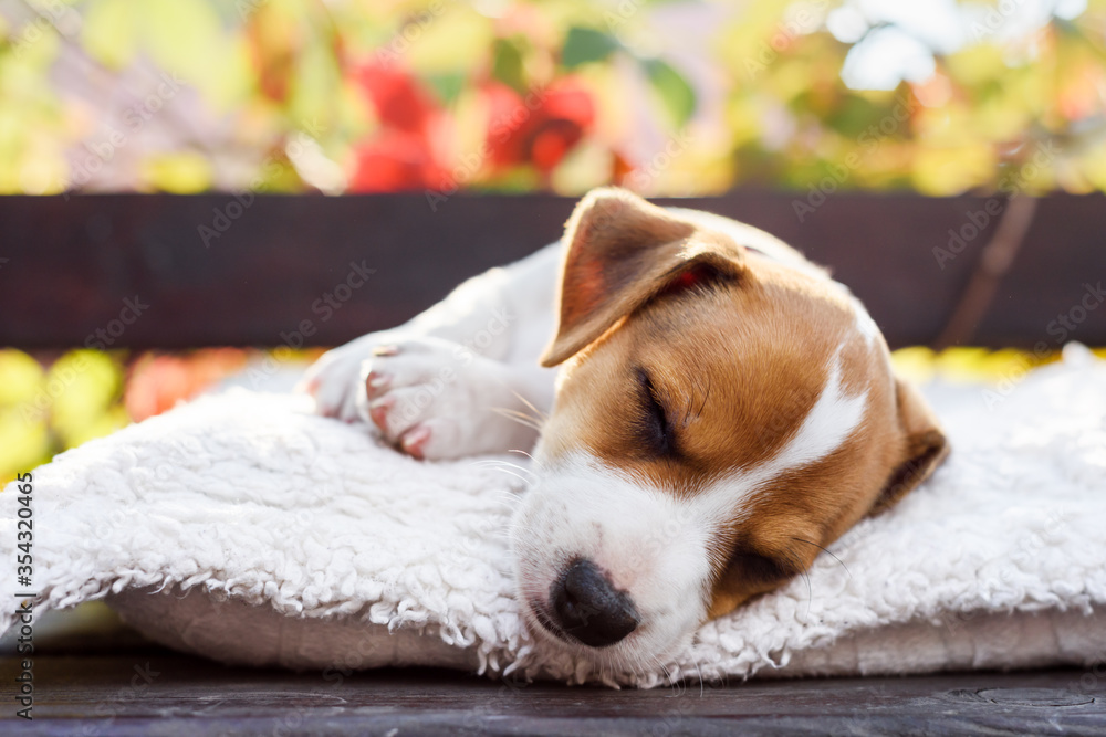 A small white dog puppy breed Jack Russel Terrier with beautiful eyes lays on white carpet on autumn terrace. Dogs and pet photography