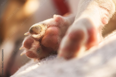A small white dog puppy breed Jack Russel Terrier paws macro closeup. Dogs and pet photography