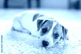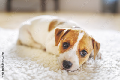 A small white dog puppy breed Jack Russel Terrier with beautiful eyes lays on white carpet. Dogs and pet photography