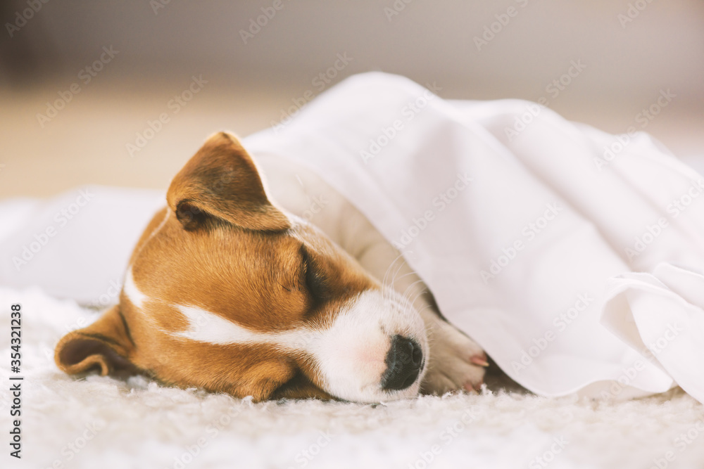 A small white dog puppy breed Jack Russel Terrier with beautiful eyes sleeping on white carpet. Dogs and pet photography