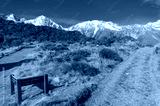 mountain valley landscape with hiking path with directional sign
