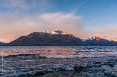 Winter mountain landscape with icy lake and snow-capped mountains
