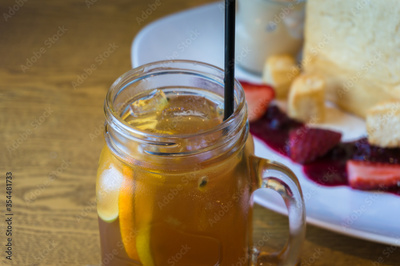 Sweet Brioche bread with berry jam and ice cream