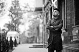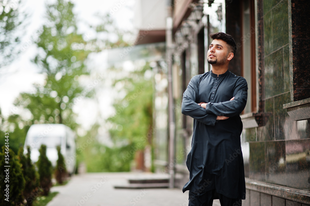 Сonfident pakistani indian muslim arabic boy in grey kameez shalwar suit.