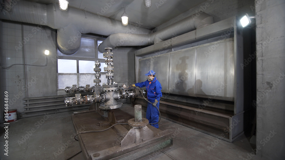 Worker in protective respirator paints oil and gas wellhead tree equipment with spray gun in production plant. Equipment for wellhead conncetion of oil and gas wells.