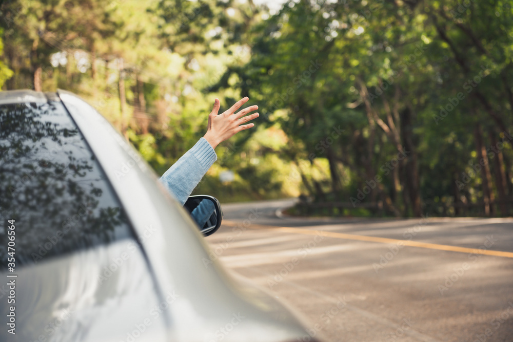 Close up woman hand with arm raised relaxing and enjoying road trip. she happy driver in car on road in nature.