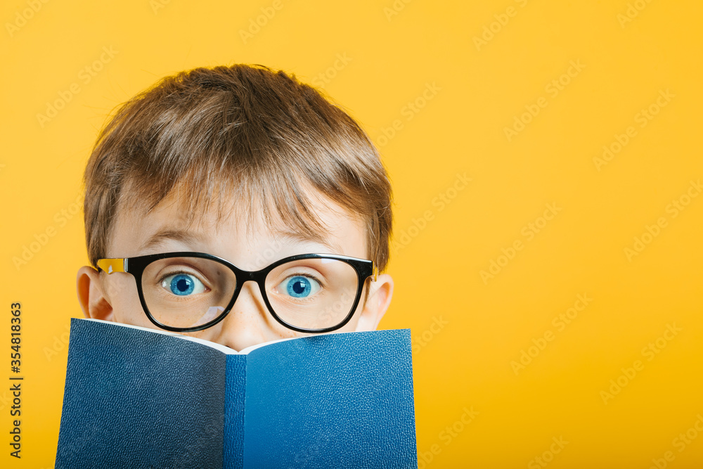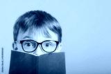 child reads a book against a bright wall