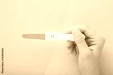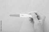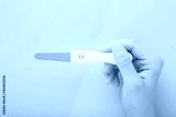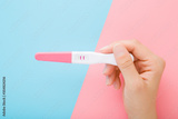 Young woman hand holding pregnancy test with two stripes on light pink blue table background. Pastel color. Two sides. Positive result. Closeup. Point of view shot. Top down view.