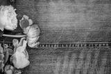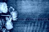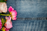 Peony flowers on denim jeans blue fabric background, closeup, copy space, text place.
