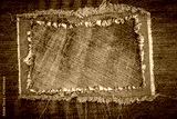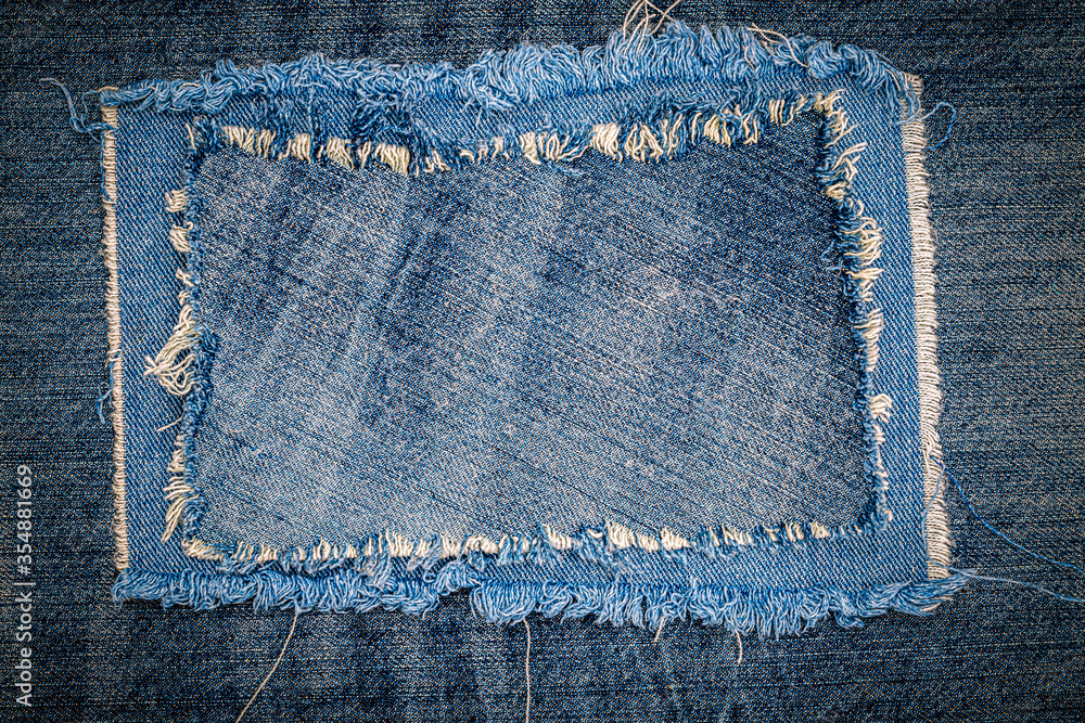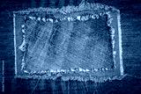 Destroyed torn denim blue jeans fabric frame on blue jeans background. Worn Jeans Casual Double Color patch Denim.