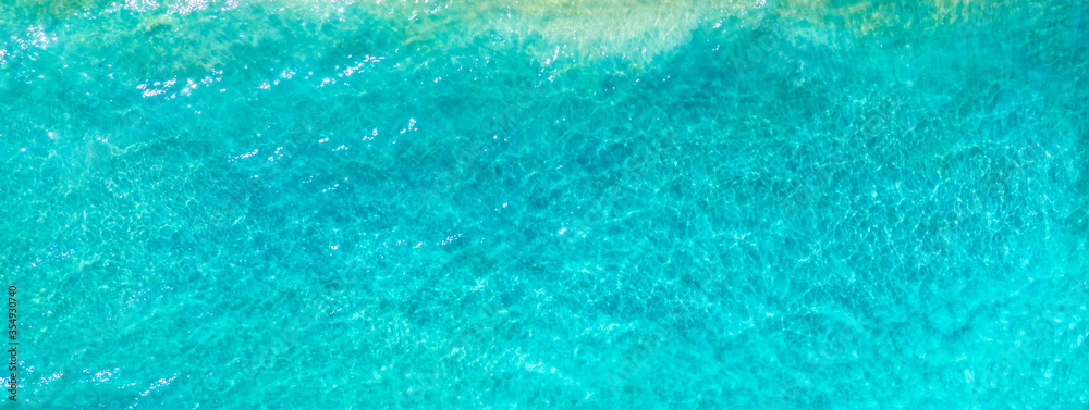 Summer vacation background. Drone aerial view of turquoise ocean. Banner format