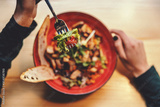 Top view of woman sitting in restaurant and having salad for lunch. Healthy lifestyle concept.