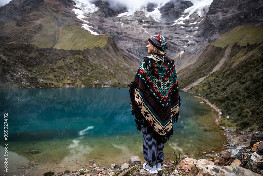 Beautiful blonde woman standing by a turquoise lake in the mountains