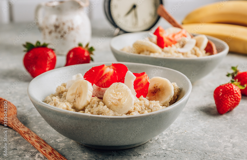Quinoa porridge with coconut milk and fresh strawberries on light gray background. Healthy Lactose and Gluten Free Breakfast.