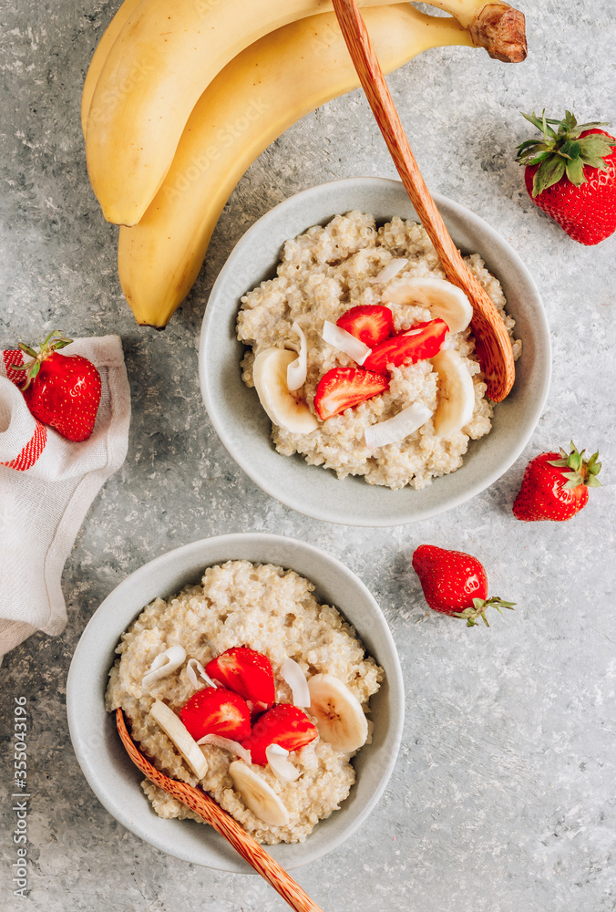 Quinoa porridge with coconut milk and fresh strawberries on light gray background. Healthy Lactose and Gluten Free Breakfast.