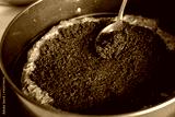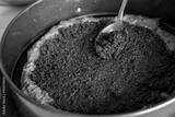 Making a cake in a baking dish. Chocolate dough and poppy seed filling. Woman smoothes the surface with a spoon. Close-up