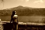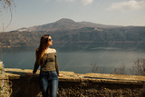 Traveler girl enjoys a beautiful view of the lake. Slender young girl travels in Italy. Woman enjoying a peaceful Green Lake. The girl is walking along the lake.