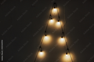 Festive decorations, white sparkling baubles and glowing lights garland. Traditional winter holiday celebration accessories. Xmas backdrop with copy space.