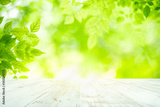 Fresh green leaves nature with bokeh on empty wooden table background for product display template and copy space using as background natural greenery landscape or wallpaper