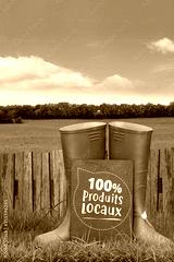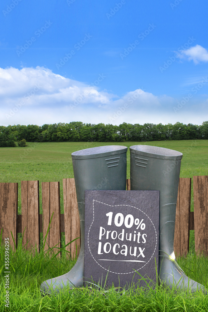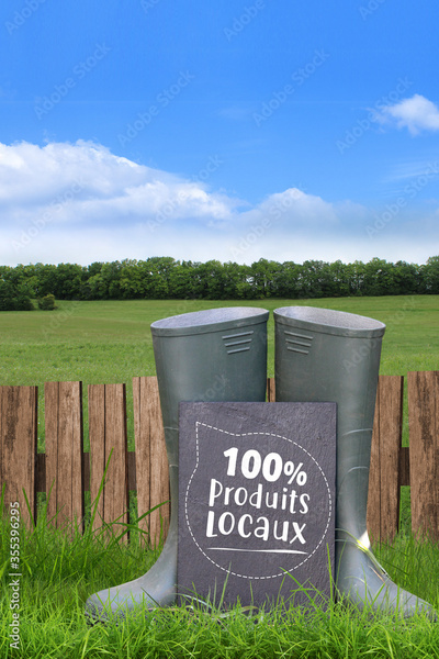 Bottes d'agriculteur dans l'herbe, produits locaux