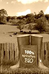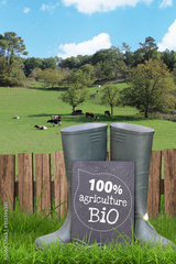 Champ avec bottes d'agriculteur dans l'herbe, agriculture bio concept