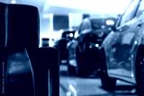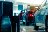 Blurred new luxury red and gray car parked in modern showroom. Selective focus on black leather sofa in modern showroom. Car dealership. Showroom interior. Automotive industry on coronavirus crisis.