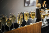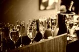 Champagne in glasses in restaurant. On a black table is a metal ice bucket with a closed bottle of alcohol inside. Filled glasses of golden drink next to each other. Holiday set.