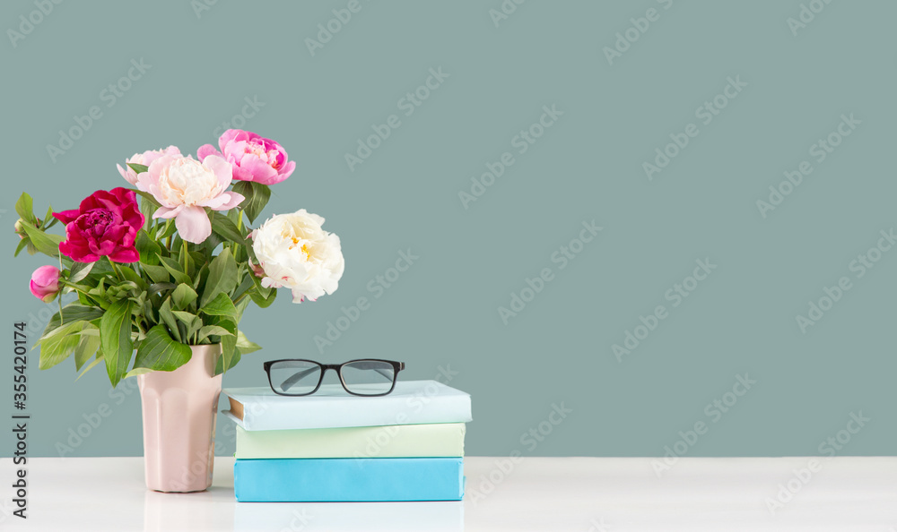 Vase of flowers and a row of books with glasses for vision on a white wooden table