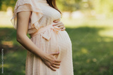Pregnant woman in tender pale rose dress. Young woman expecting a baby girl. Future mother. Pregnancy. Expectation of a child. Tummy of a pregnant woman. Motherhood. Health of the future mother.
