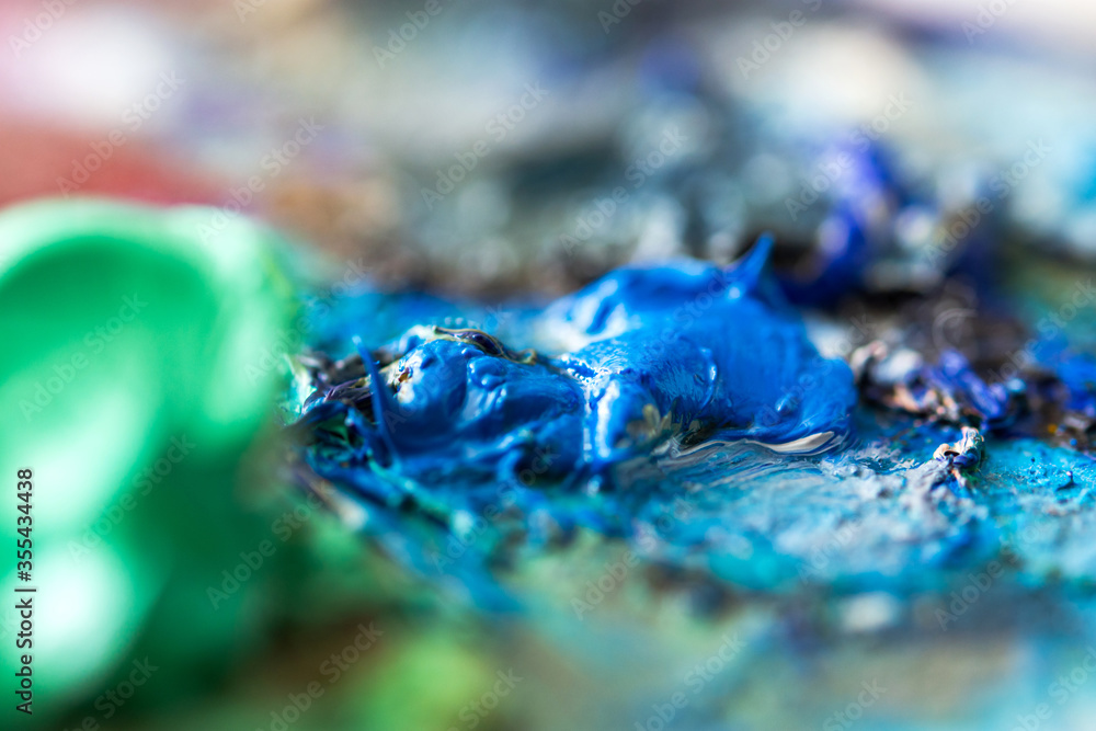 Blue oil paint close-up on the artist's palette. Hobbies and leisure. Top view of the palette. Abstract art background. Creative process. Selective focus. Ceruleum blue hue paint.