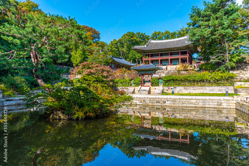 Traditional building at Buyongji Pond inside secret garden of Changdeokgung palace in Seoul, Republic of Korea